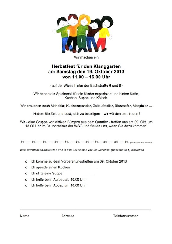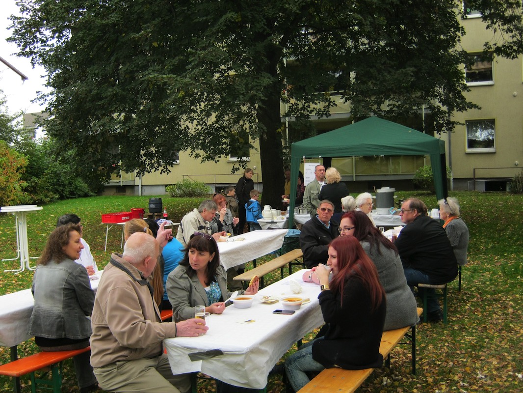 Das erste Herbstfest im Klanggarten war ein voller Erfolg. Kuchen, Kaffee, Suppen, das Spielmobil der Stadt Köln und natürlich das eine oder andere Kölsch trugen zwar zur Stimmung bei – doch vor allem die Herzlichkeit der Klanggärtner, der Bewohner, machte das Fest zu einer wunderschönen Erinnerung.